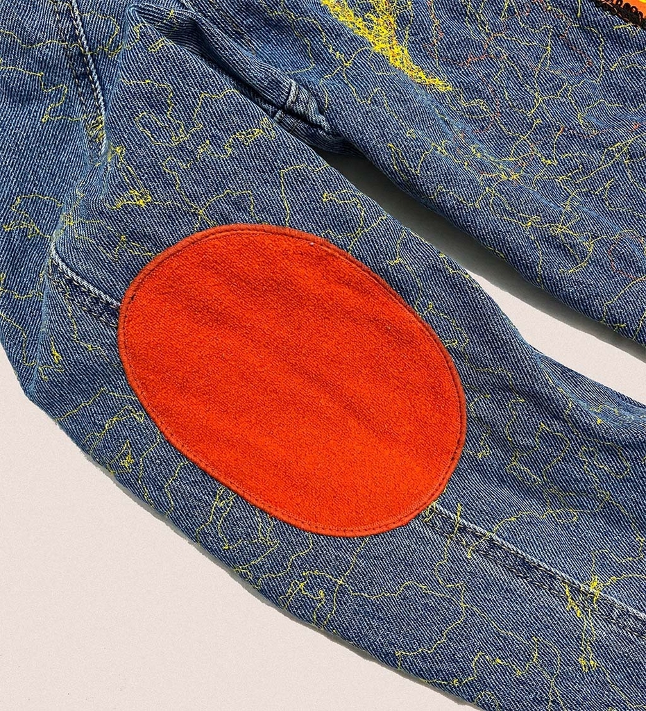 Parche estampado con diseño Geométrico Naranja y Amarillo con Ojos ALFA / OMEGA en la espalda.