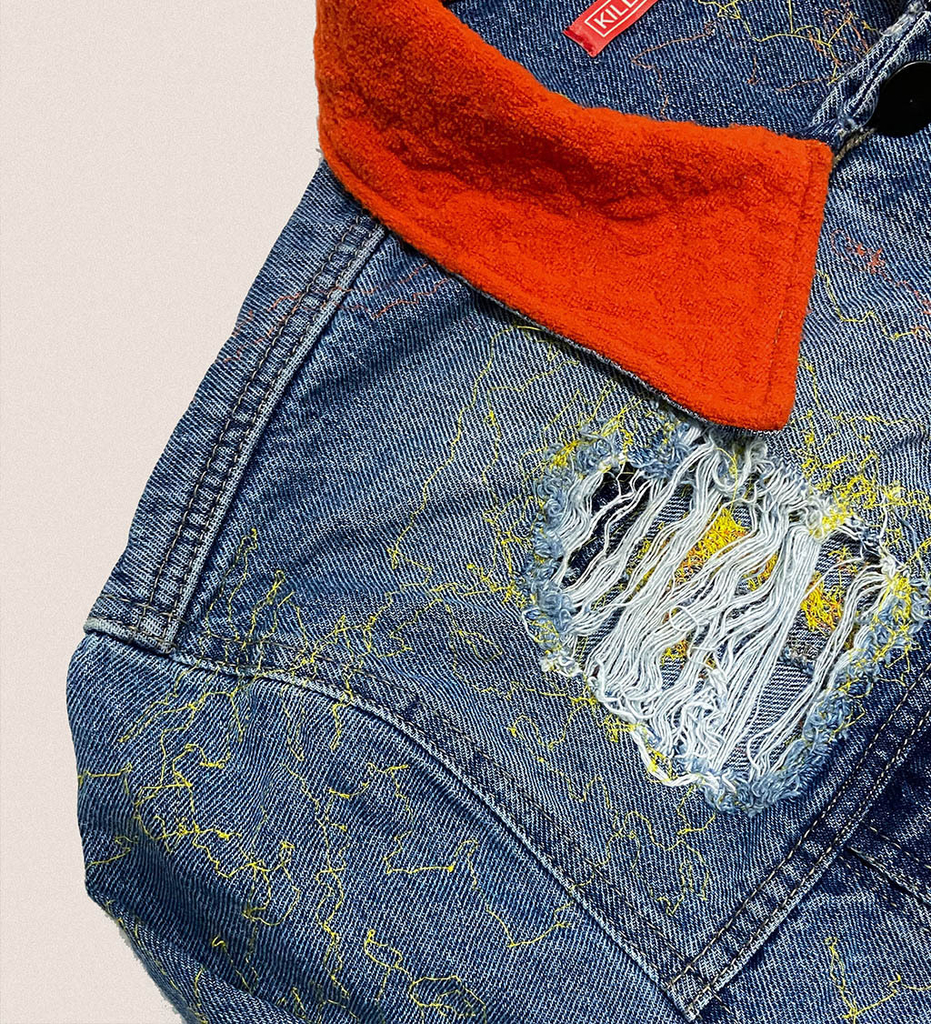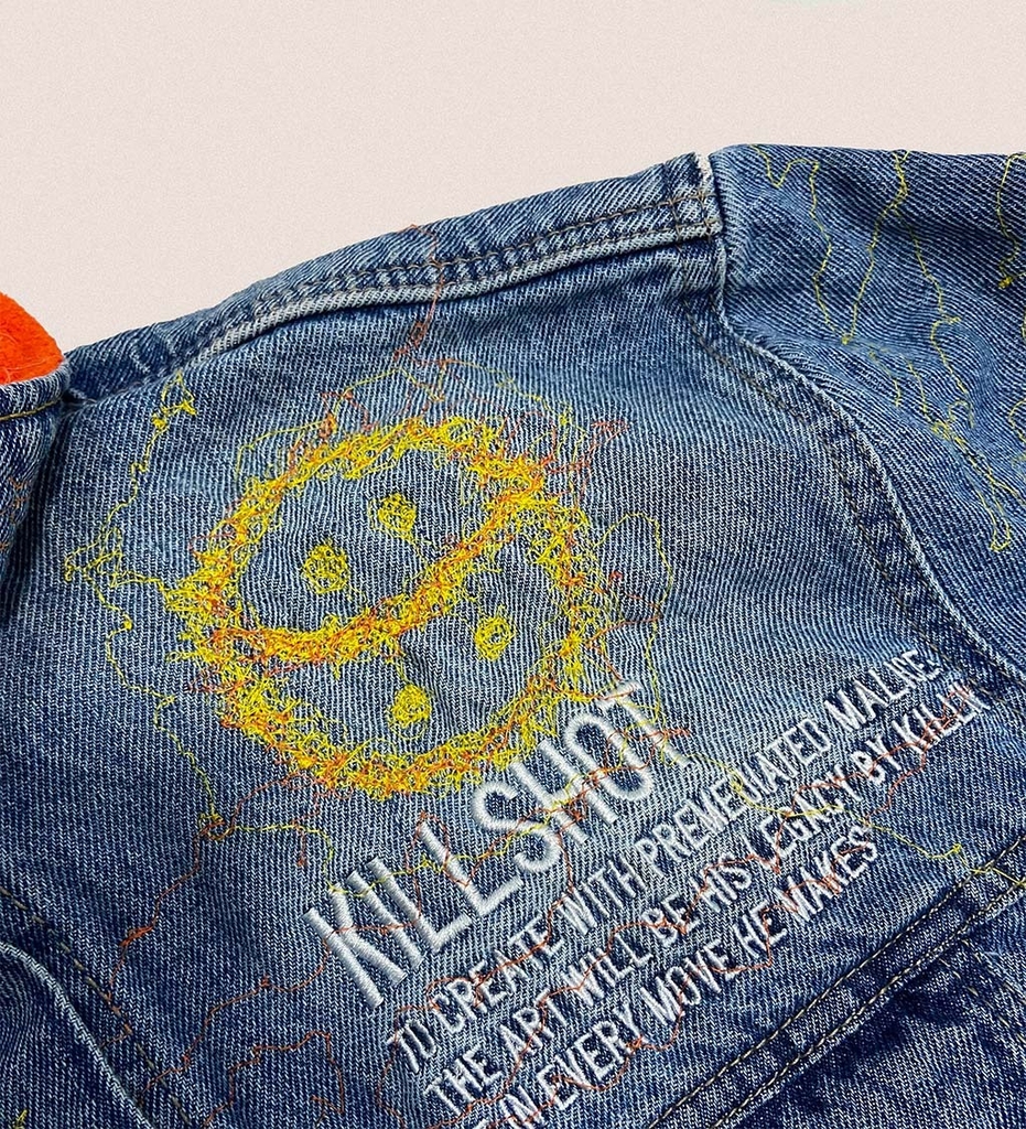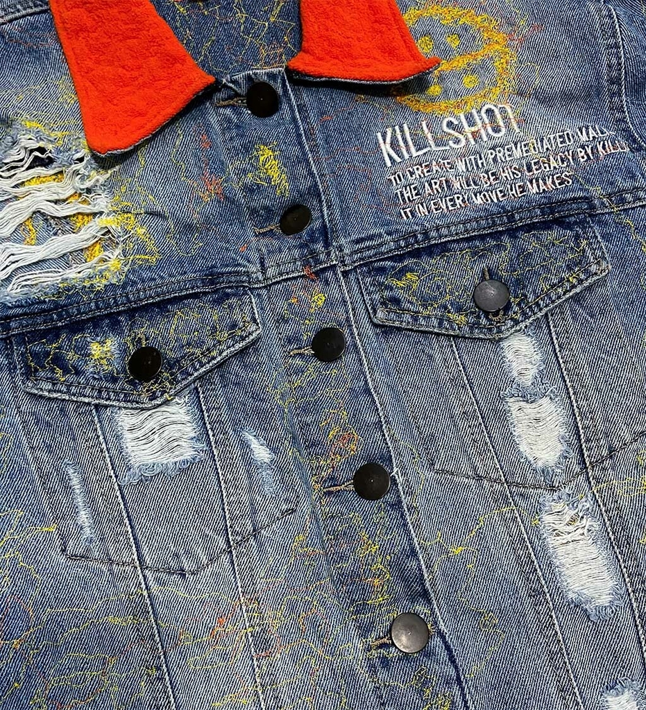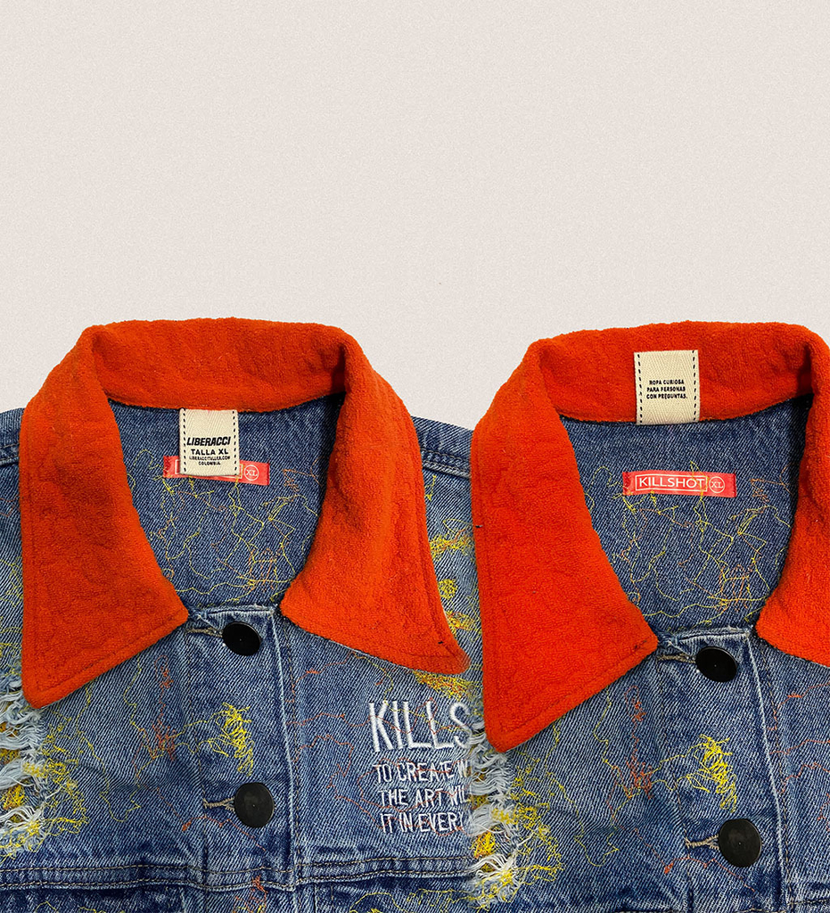 Tuvimos la oportunidad de trabajar con KILLSHOT, una marca creada en Nueva York por el joven artista y compositor colombiano 23 Grams, quien para esta ocasión se junta con Liberacci para poner una de sus chaquetas de Denim Rígido en fit clásico para ser intervenida por nuestras manos.