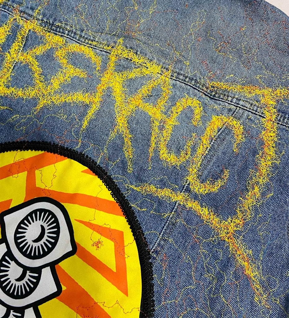 Utilizamos nuestra característica técnica de bordado libre en tejido de telaraña sobre toda la chaqueta.